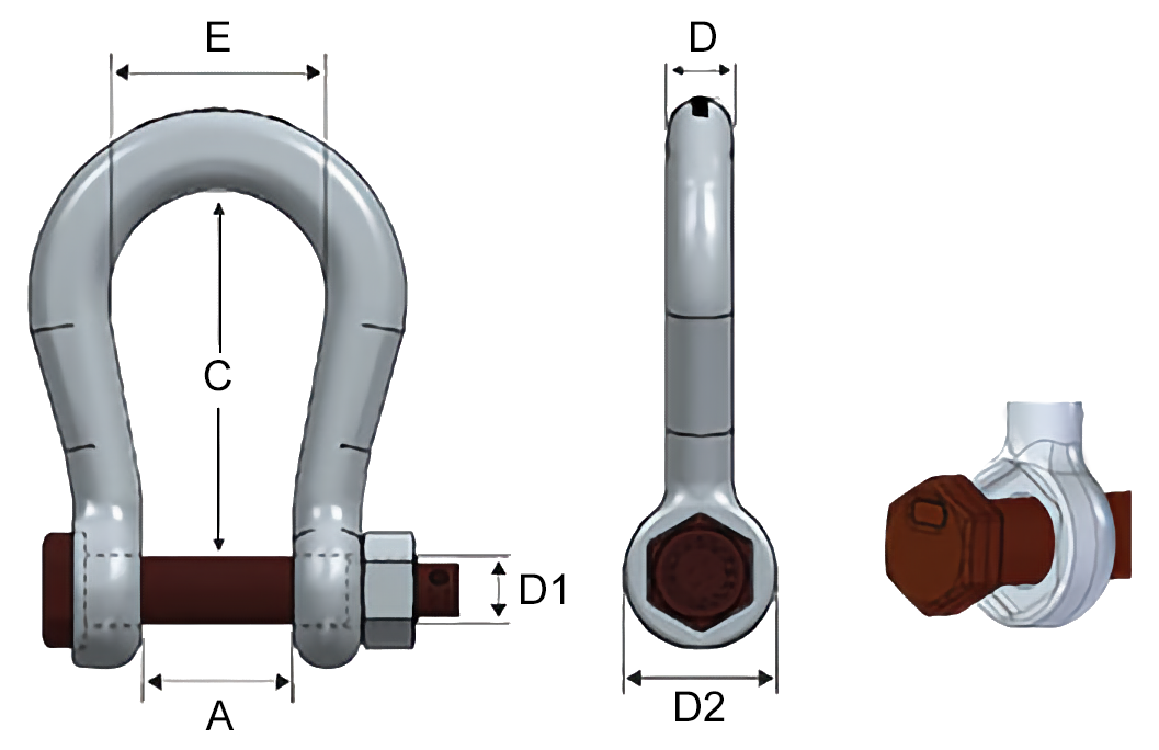 | Art.nr | Type | MBL (tonn) | D (mm) | A (mm) | C (mm) | E (mm) | D1 (mm) | D2 (mm) | Vekt (kg) |